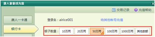 在选择面额时,最少可选择10万两=10元,也可自己填写所需的金额