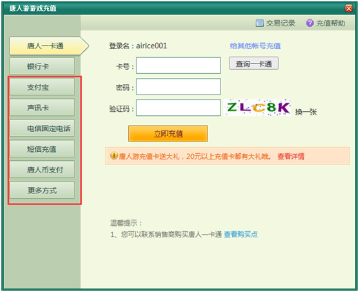 如果您觉得以上充值方式都不适合您,你还可以采用支付宝、手机短信、固定电话、唐人币支付等充值方式